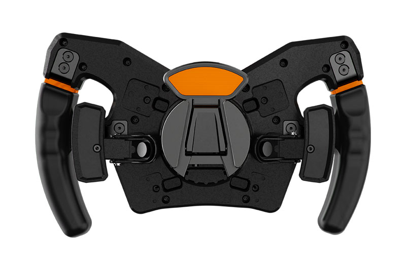 The backside features, by default, two contactless magnetic shifter paddles, for fast and seamless gear shifts. The wheel is easily upgradeable to a dual-clutch for perfect race starts as well as two additional mappable paddles that, for example, can be used for effortless overtake and DRS activation. All paddles and associated mechanics are, like the wheel chassis itself, injection molded with an ultralight and stiff carbon composite material.