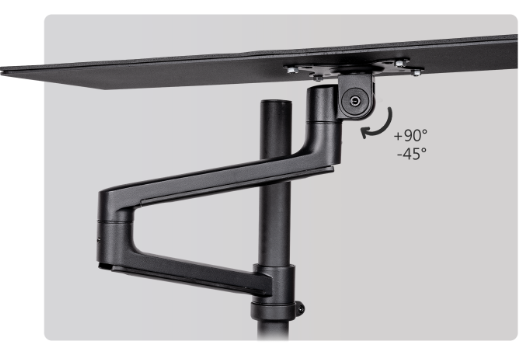 EinstellbarkeitBis zu 15 Grad Winkelverstellung, einstellbare Höhe und drei horizontale Drehachsen. Die Ablagefläche kann um 90 Grad nach oben und unten gekippt werden.