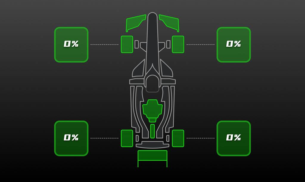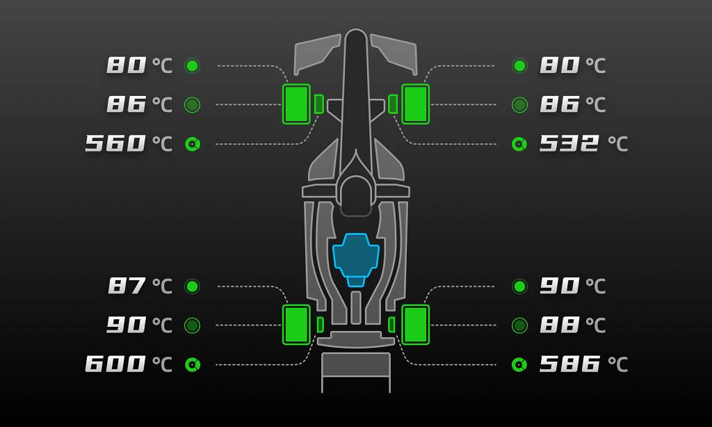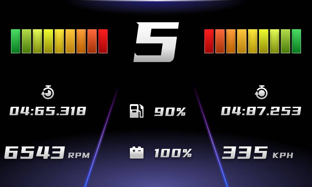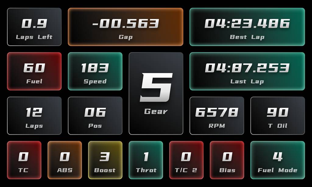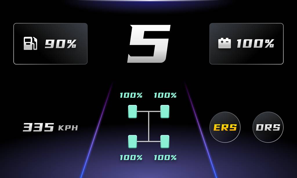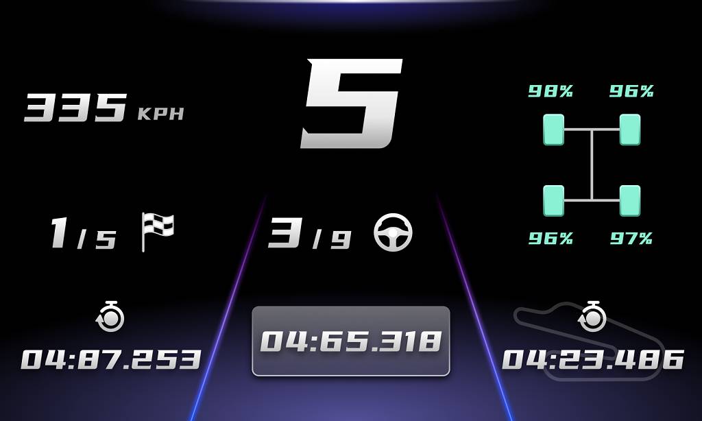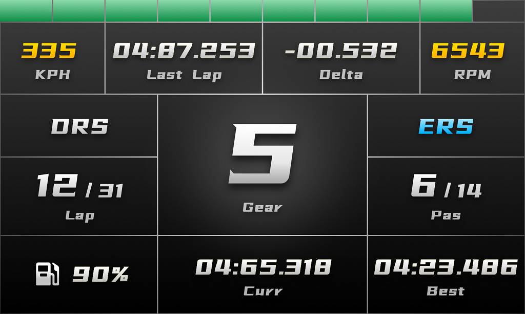Inspired by real racing cars, our redesigned interface adopts a new, flat style, with 15 different configurations possible, so drivers can get the essential information when they need it most: speed, RPM, gears, tire temperatures, relative times, current or fastest lap times, fuel, ERS levels, vehicle status, damage, DRS and much more.