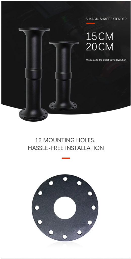 This Motor Shaft extender allows you to mount your Simagic wheel base 15cm or 20cm away to provide additional clearance for your monitors or custom setup.