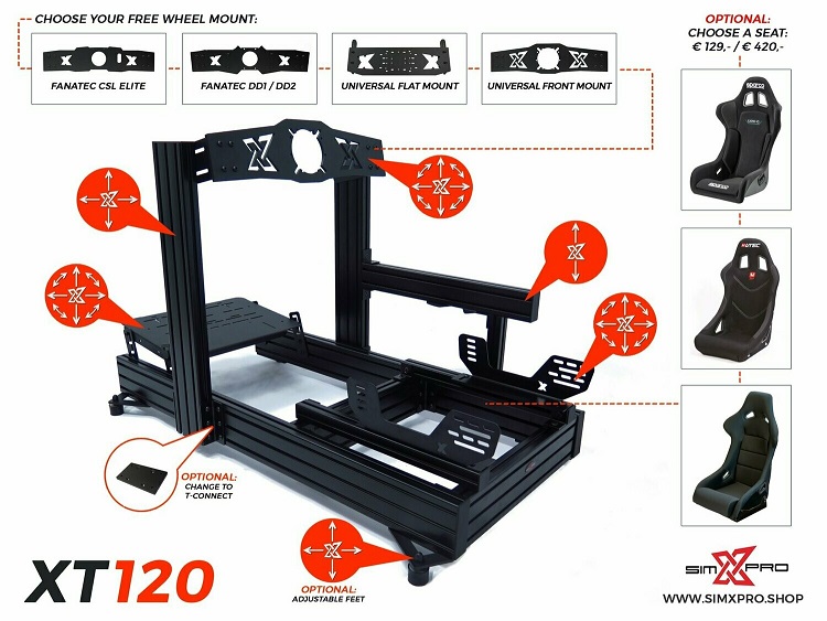 The XT120 is a good choice for the simracer who wants to get more out of there rigs in terms of strength and adjustability. Expanding and upgrading is very easy because all our parts can be used with all our profiles. You are not tied to one model or a fixed setup. The XT120 is our high end model with shifter mount and (front) wheel mount of choice. You can also choose if you want to have the uprights connected with our steel corner brackets our Aluminium T-connect plates.The XT120 can hold the forces of every Direct Drive.