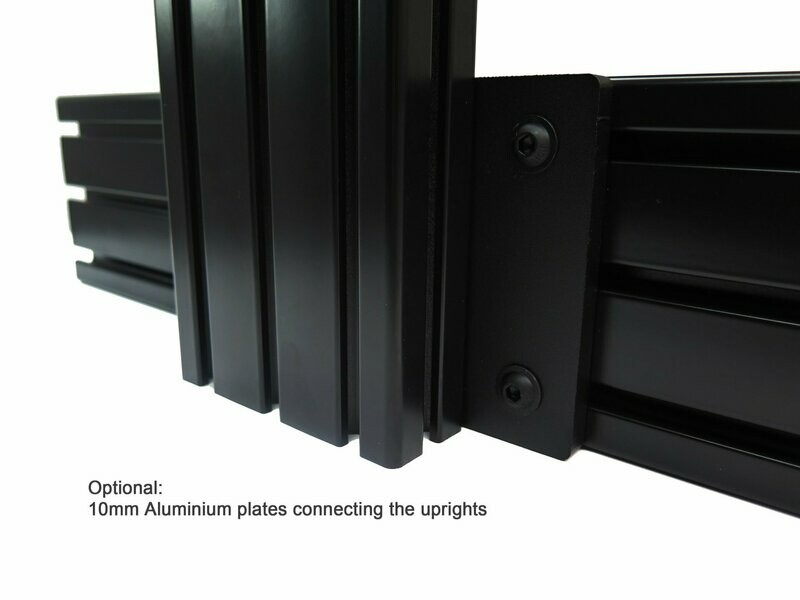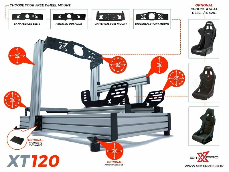 The XT120 is a good choice for the simracer who wants to get more out of there rigs in terms of strength and adjustability. Expanding and upgrading is very easy because all our parts can be used with all our profiles. You are not tied to one model or a fixed setup. The XT120 is our high end model with shifter mount and (front) wheel mount of choice. You can also choose if you want to have the uprights connected with our steel corner brackets our Aluminium T-connect plates.The XT120 can hold the forces of every Direct Drive.