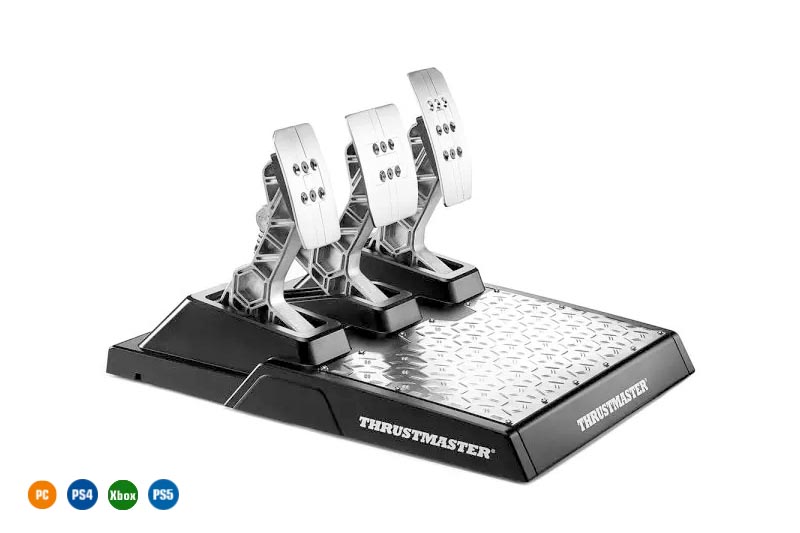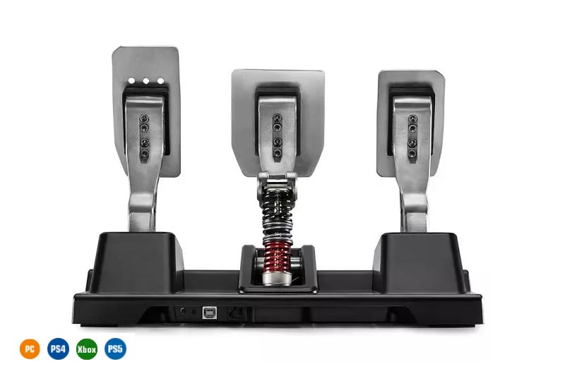 Das T-LCM Pedals-Set ist vielseitig und stabil und gibt Benutzern signifikante Vorteile im Rennen: die Pedale können verstellt werden; ein Set mit 6 Sprungfedern bietet eine Vielzahl von Anpassungsmöglichkeiten; das Set besteht zu 100% aus rutschfestem Metall; und die Einstellungen des Pedalsets (Deadzones und elektronische Bremskraft [Brake Force]) können mithilfe der mitgelieferten Software justiert werden.