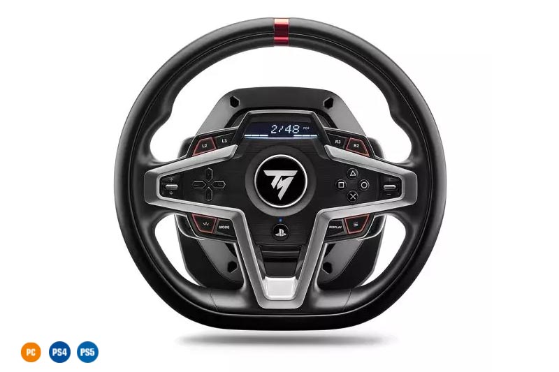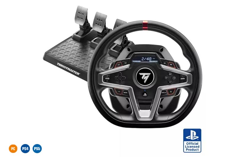 Das T248 liefert 70 % mehr Leistung (im Vergleich zu den vorherigen Hybrid-Rennlenkrädern der Thrustmaster T150-Serie) und bietet innovative neue Funktionen wie Force-Feedback-Voreinstellungen, die während des Spiels geändert werden können, magnetische Schaltwippen, ein interaktives Display mit mehr als 20 verschiedenen Anzeigemöglichkeiten und ein magnetisches Pedalset mit 4 Bremsdruckmodi für das Bremspedal.