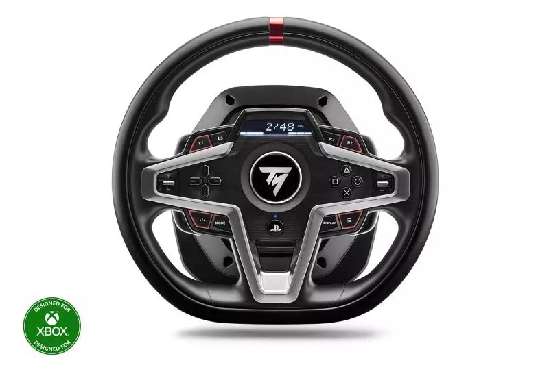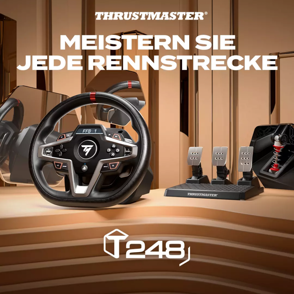 Das T248 liefert 70 % mehr Leistung (im Vergleich zu den vorherigen Hybrid-Rennlenkrädern der Thrustmaster T150-Serie) und bietet innovative neue Funktionen wie Force-Feedback-Voreinstellungen, die während des Spiels geändert werden können, magnetische Schaltwippen, ein interaktives Display mit mehr als 20 verschiedenen Anzeigemöglichkeiten und ein magnetisches Pedalset mit 4 Bremsdruckmodi für das Bremspedal.